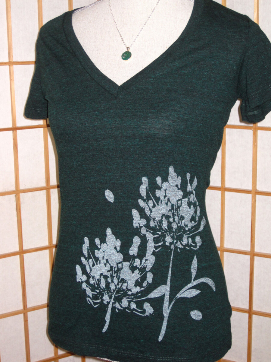 The pale image of an agapanthus flower is lightly screened to create a delicately hazy white print against deep forest green heather. A deep v-neck spells fashion, while the cut is comfortable enough to kick back in, but never tight, and never boxy. Longer length.