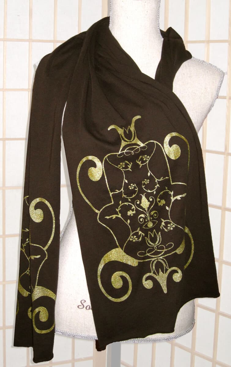 Golden vines and flowers on our hamsa design lend a touch of mystical grace to a fabulously long deep brown scarf in silky pima cotton. The muted metallic gold makes this scarf subtly elegant, yet divinely soft, comfortable and never glitzy.