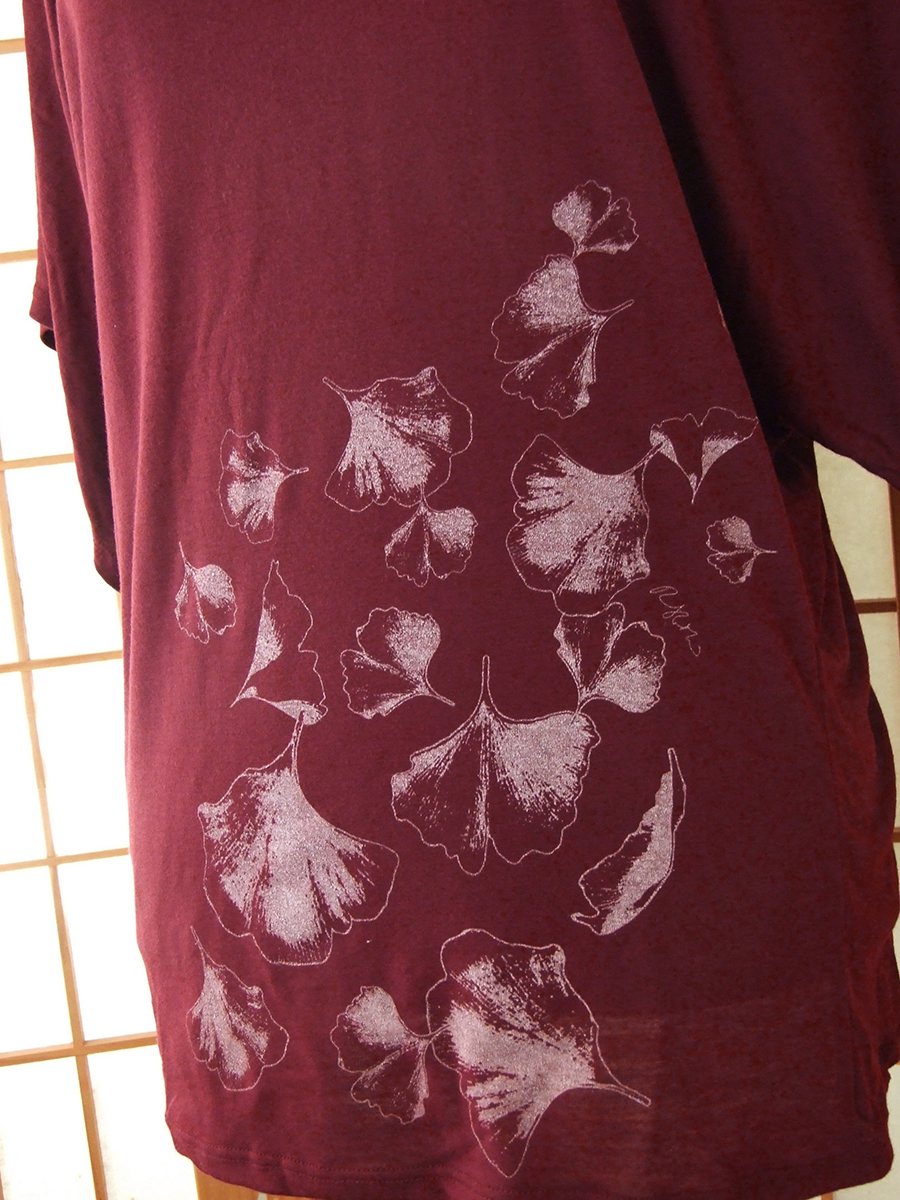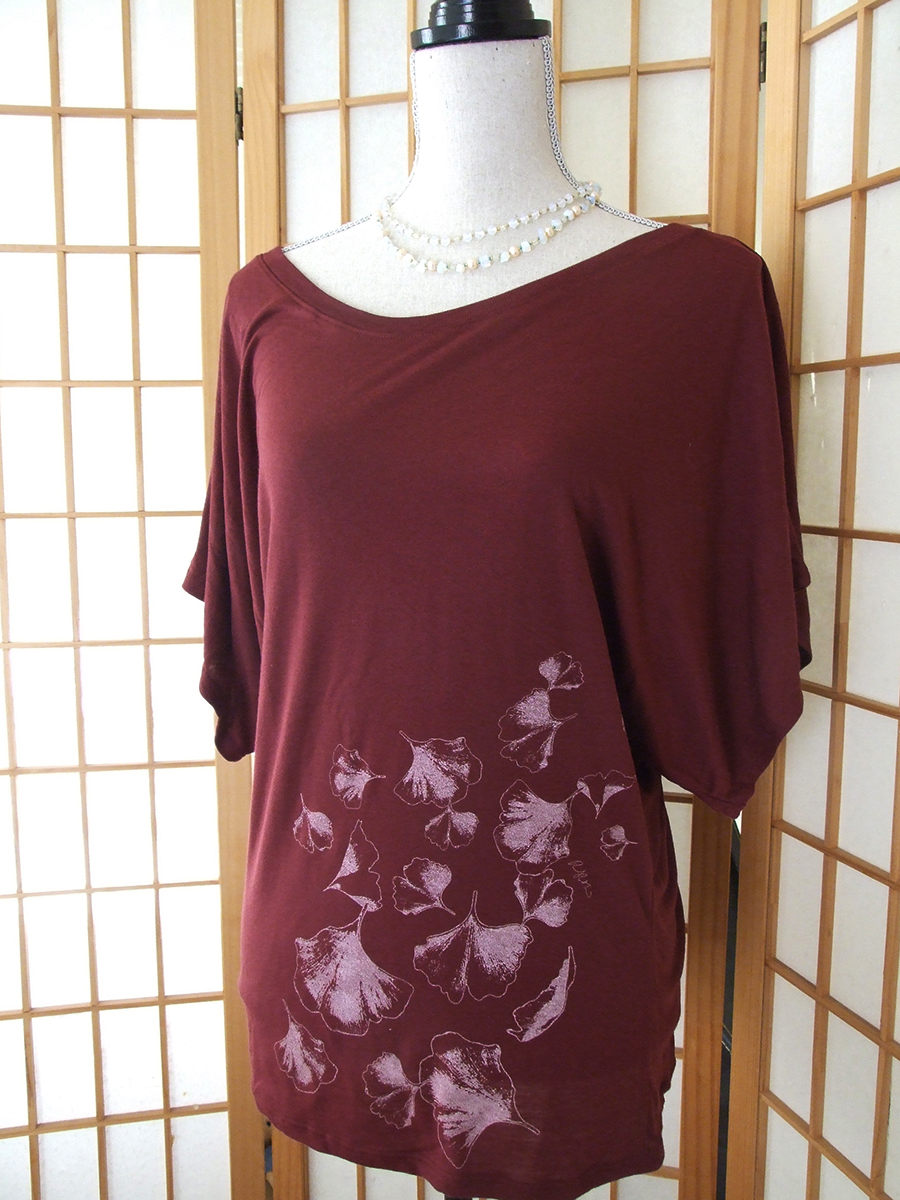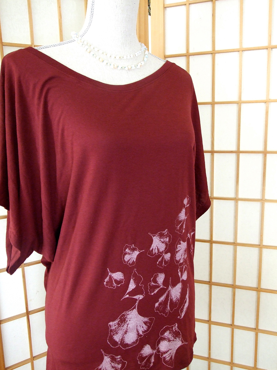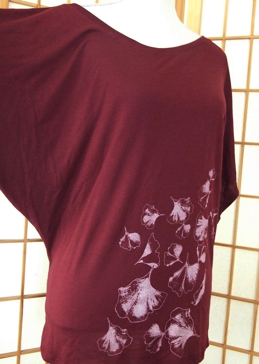Who says you can’t have elegance plus comfort in one? A soft top with dolman sleeves in the color of dark cherry wine features my original ginkgos art delicately screened for a beautifully translucent effect. Can be worn straight or softly folded over at the hip.